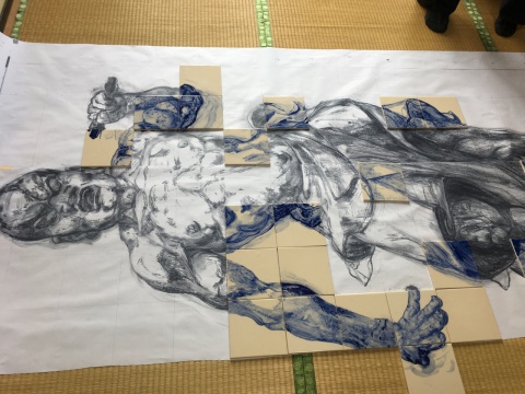 15cm四方のタイルに絵付けをして平面上で仁王像を完成させます。