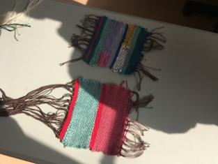 1日目「暮らしの手仕事~織り(応用)」は1年時に制作しましたが、今回は織り機を使用して作品を仕上げました。当然、糸が細いと時間がかかります。しかし、とても細かくきれいな仕上がりです。縦糸と横糸に何を使用するかで風合いや色彩が豊かになっていきます!